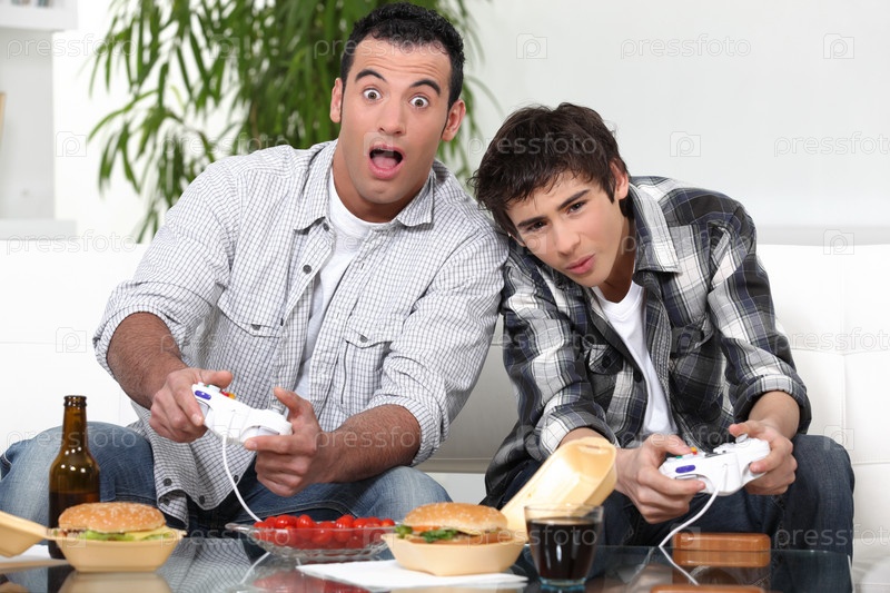 Отец и сын играют в видеоигры