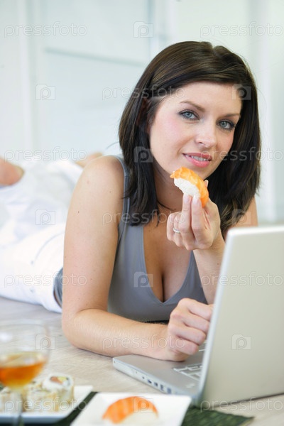 Женщина ест суши, работая за ноутбуком