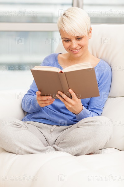 Улыбающаяся женщина читает книгу на диване