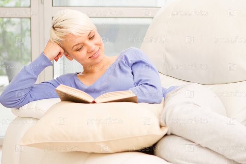 Улыбающаяся женщина читает книгу на диване