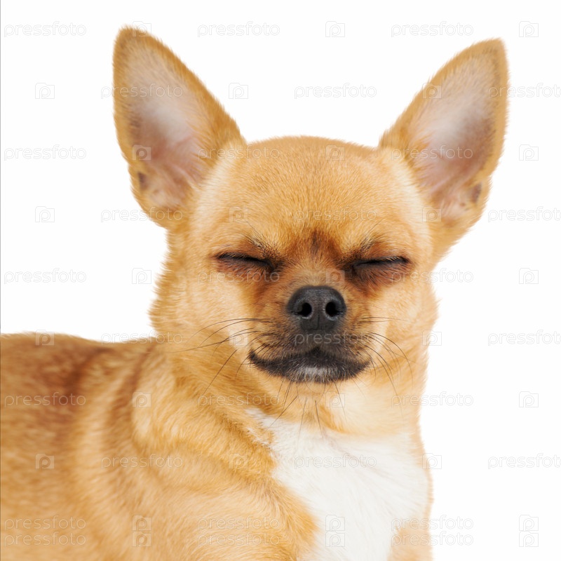 Рыжий чихуахуа с закрытыми глазами на белом фоне