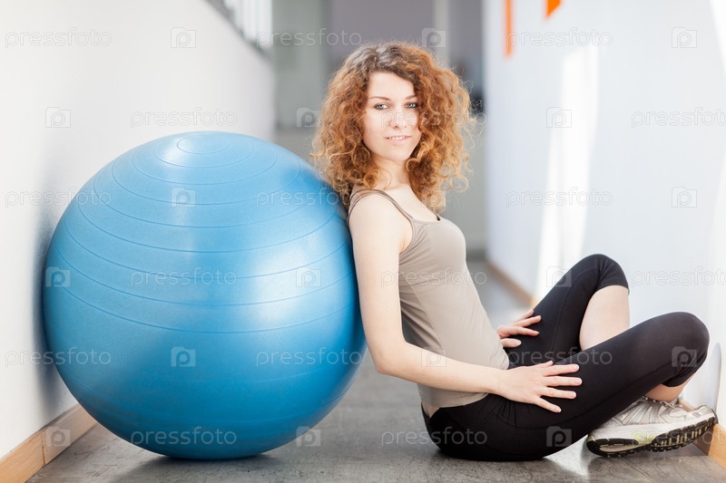 Молодая женщина делает упражнение с мячом в тренажерном зале