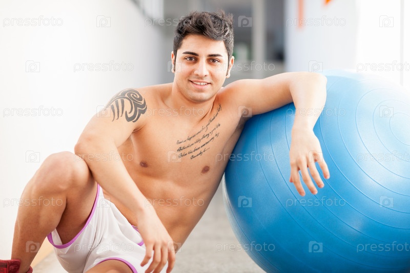 Улыбающийся мужчина делает упражнение с мячом в тренажерном зале