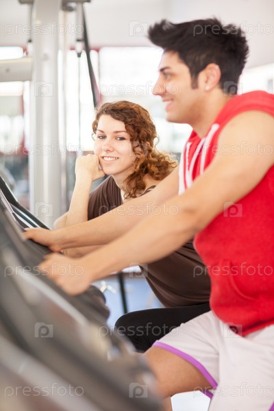 Мужчина в тренажерном зале на велотренажере