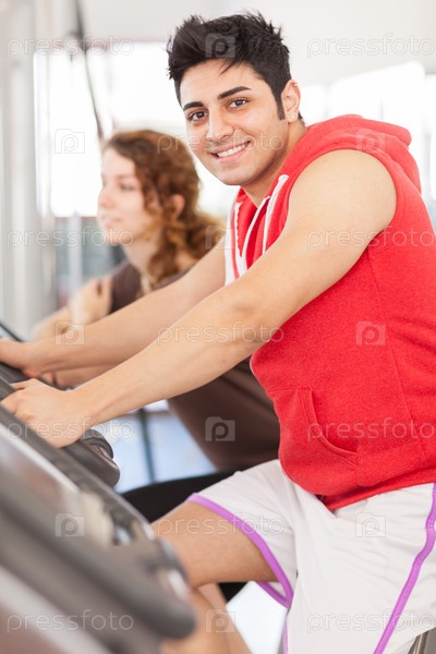 Мужчина тренируется на велотренажере в зале