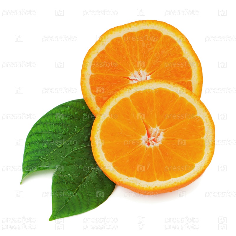 Свежий апельсин с листьями на белом фоне
