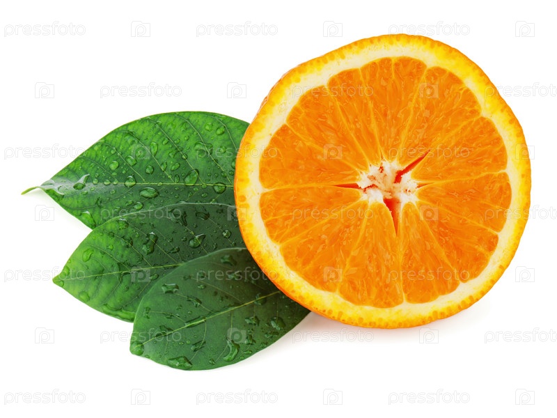 Свежий апельсин с листьями на белом фоне