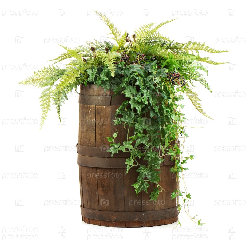 Композиция из искусственных цветов в старой деревянной бочке, изолировано на белом фоне
