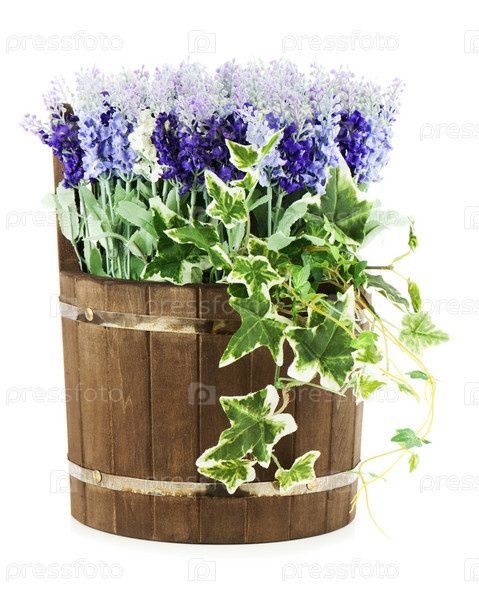 Композиция из искусственных цветов в старой деревянной бочке, изолирована на белом фоне