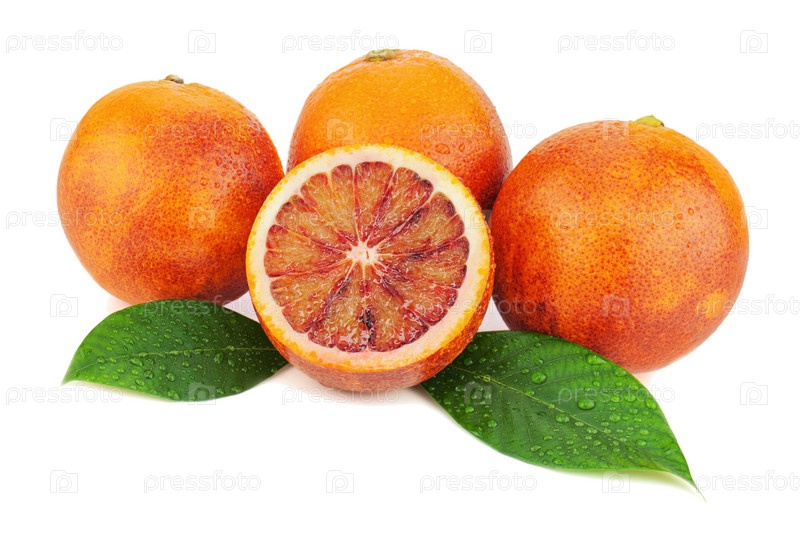 Спелый красный апельсин с зелеными листьями на белом фоне