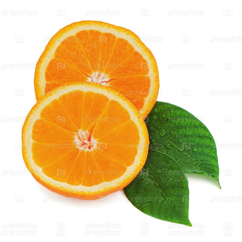 Свежий апельсин с листьями на белом фоне