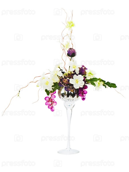 Цветочная композиция из искусственных цветов в стеклянной чаше на белом фоне