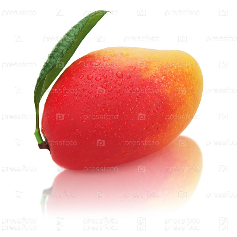 Свежий манго с зелеными листьями на белом фоне