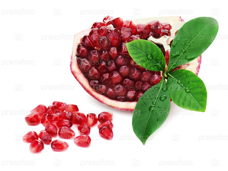Часть граната с зелеными листьями на белом фоне