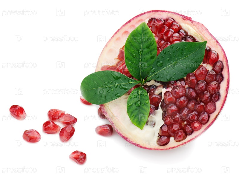 Часть граната с зелеными листьями на белом фоне