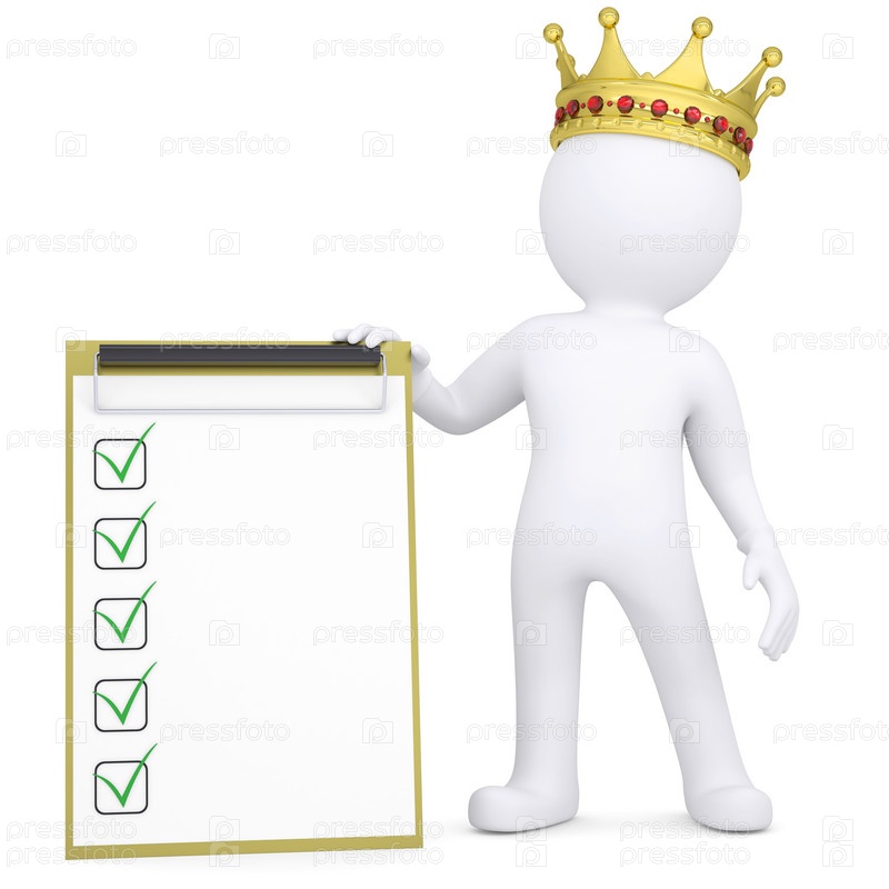 3D белый человек с короной держит контрольный список