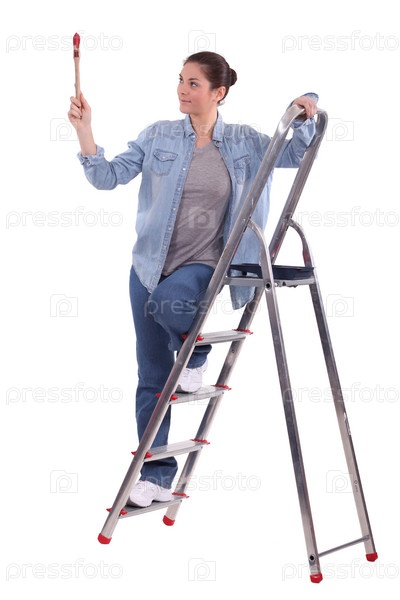 Маляр на лестнице с поднятой кистью