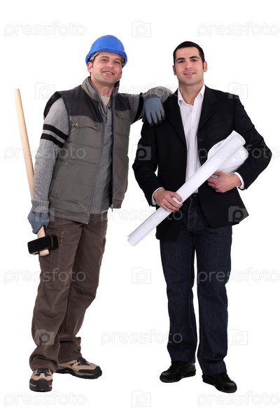 Рабочий и бизнесмен позируют вместе