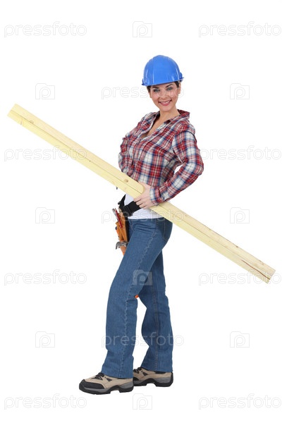 Портрет молодой женщины-плотника с пиломатериалами