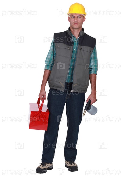 Рабочий с инструментами и кружкой