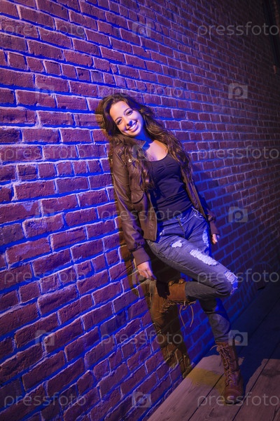 Молодая женщина смешанной расы у кирпичной стены