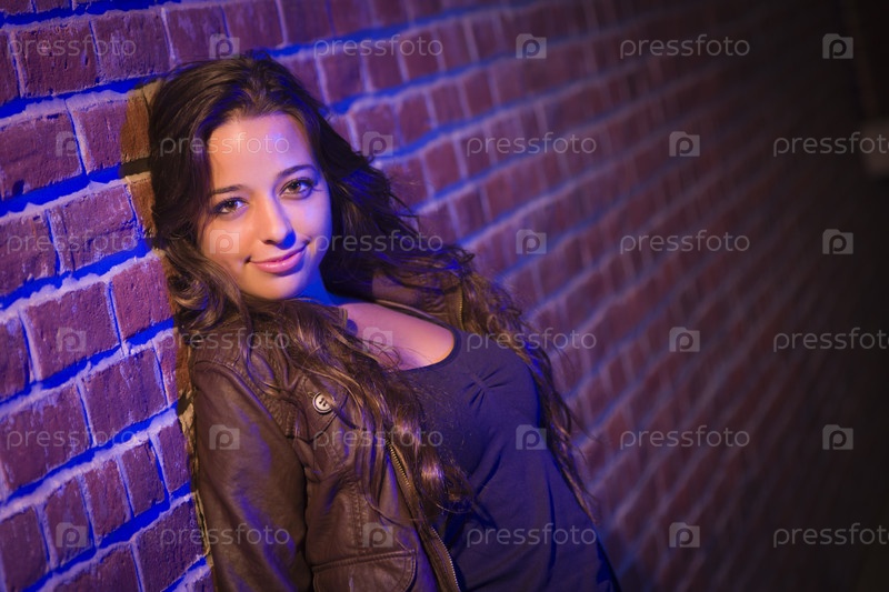 Молодая женщина смешанной расы у кирпичной стены