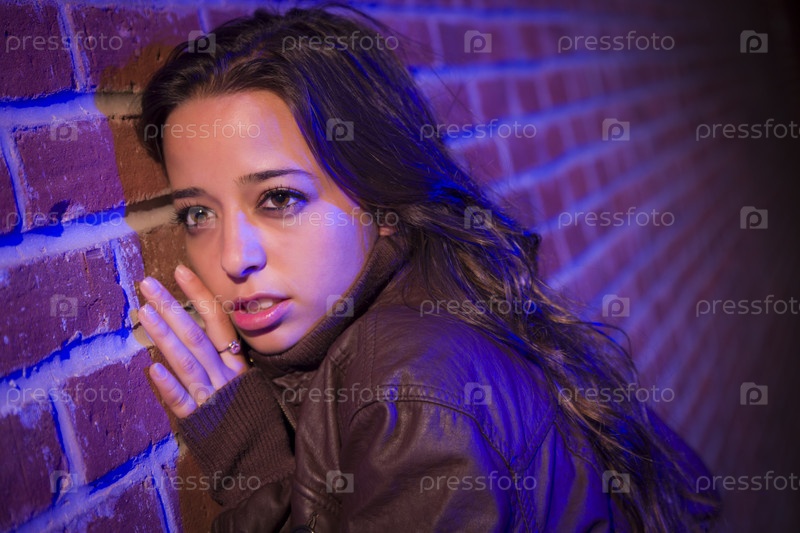 Испуганная молодая женщина смешанной расы у кирпичной стены