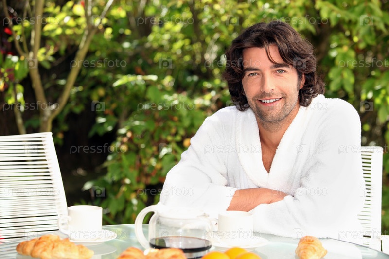 Мужчина за завтраком в отпуске