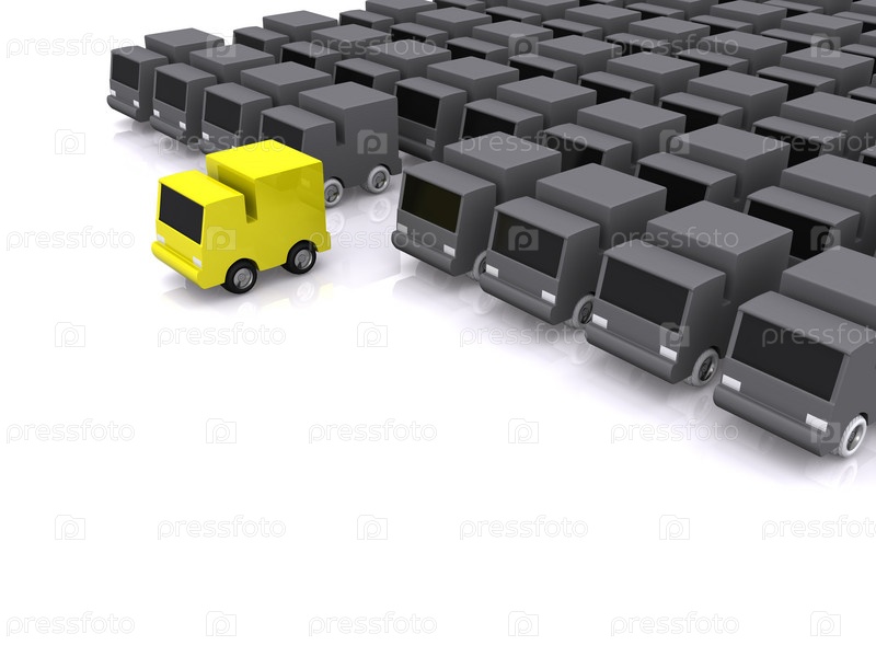 Желтый грузовик лидирует на фоне множества серых. 3D