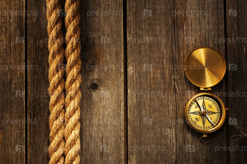 Античный компас и канат на деревянном фоне