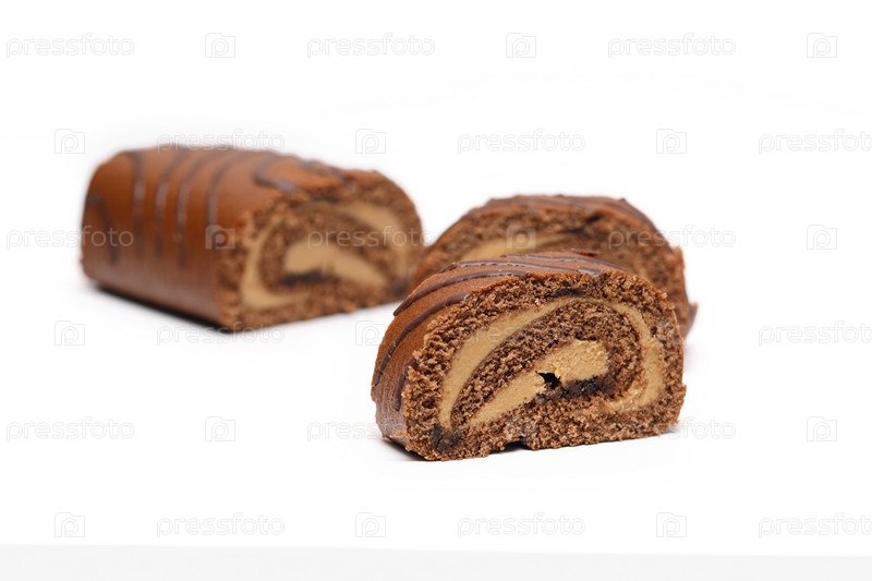 Ломтики шоколадного рулета на белом фоне