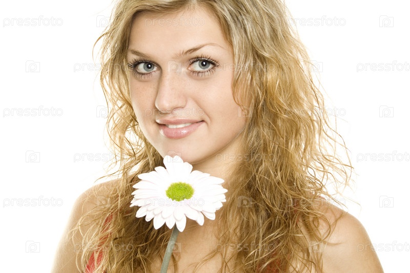 Симпатичная блондинка с белой ромашкой