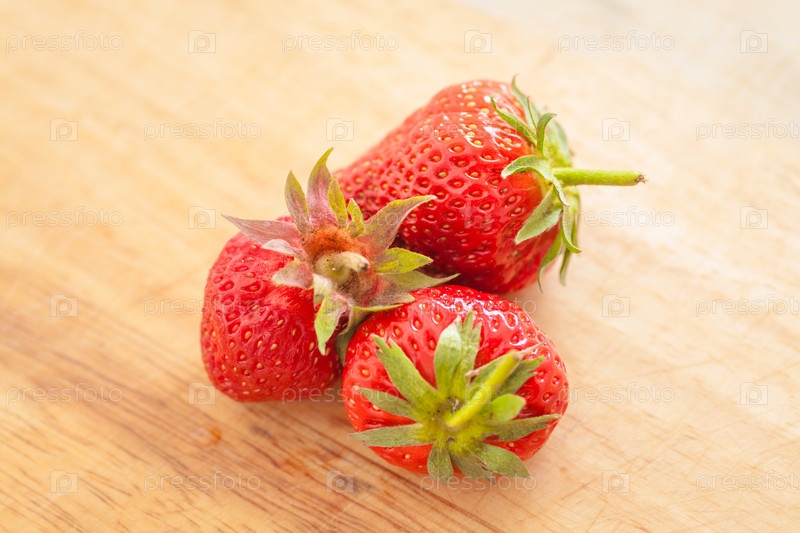 Три клубники на деревянном столе