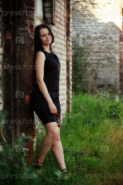 Симпатичная девушка в черном платье возле заброшенного кирпичного дома