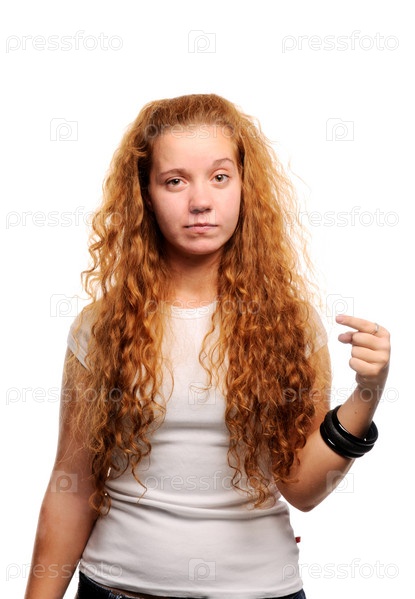 Симпатичная рыжеволосая девушка указывает пальцем на что-то