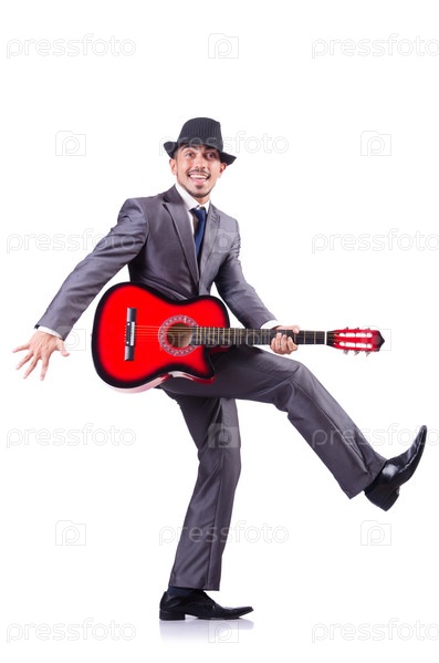 Бизнесмен с гитарой, изолированный на белом
