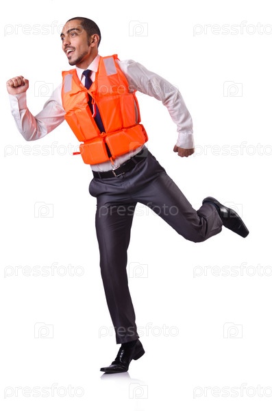 Человек в спасательном жилете, изолированный на белом