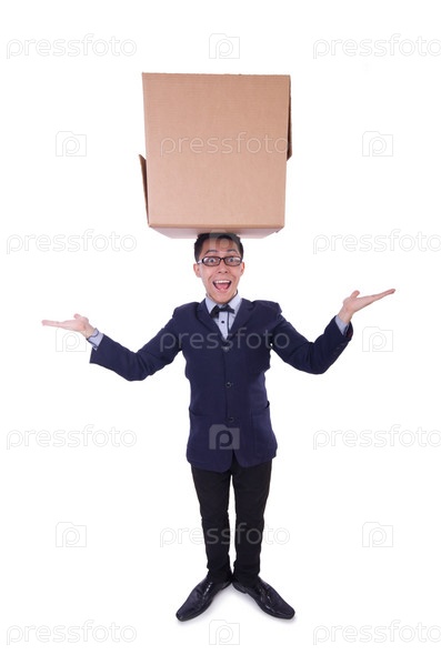Забавный мужчина с коробкой на белом фоне