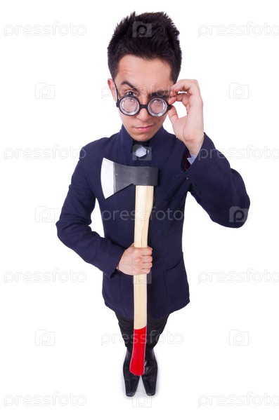 Забавный человек с топором на белом фоне