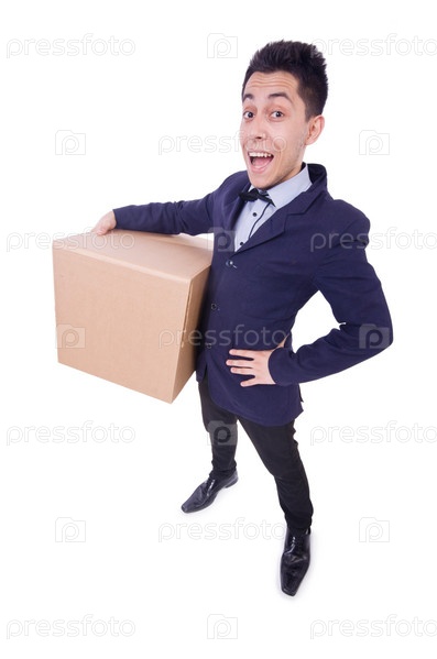 Забавный мужчина с коробкой на белом фоне