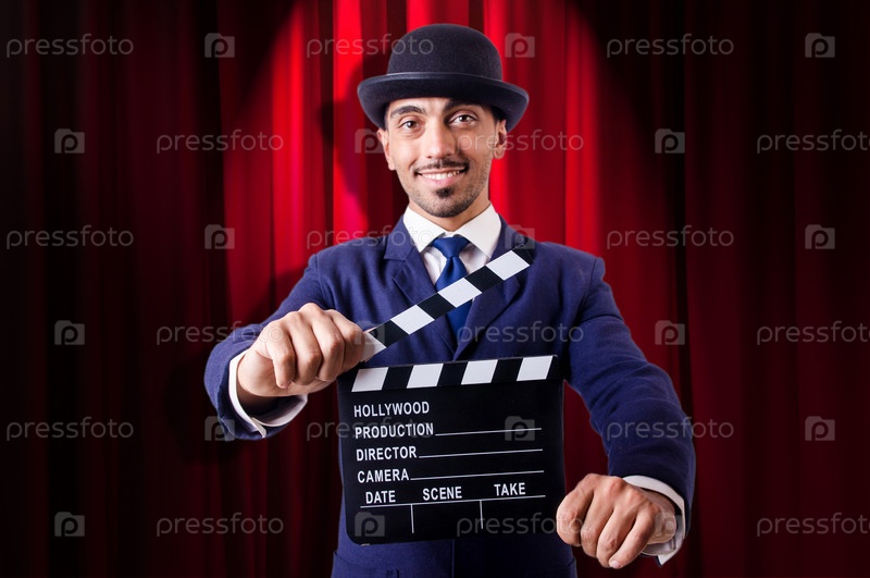 Человек с кинохлопушкой на фоне занавеса
