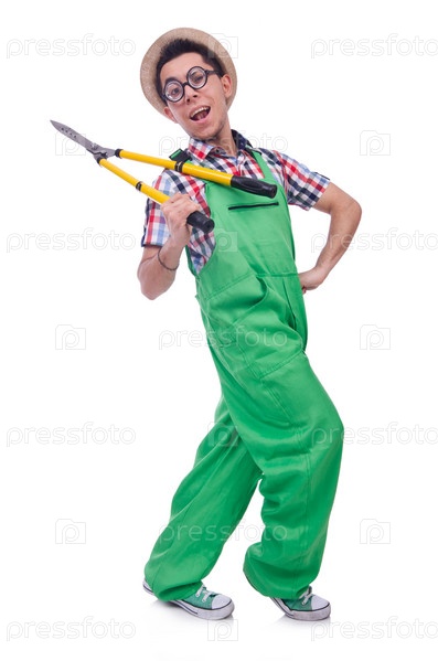 Забавный человек с ножницами на белом фоне