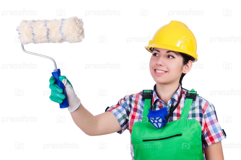 Женщина-маляр с кистью на белом фоне