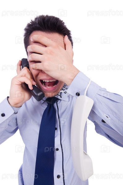 Сумасшедший человек с телефоном на белом фоне