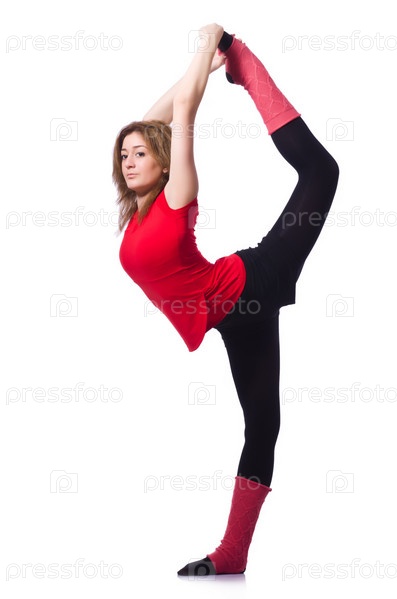Молодая гимнасткой тренируется на белом фоне