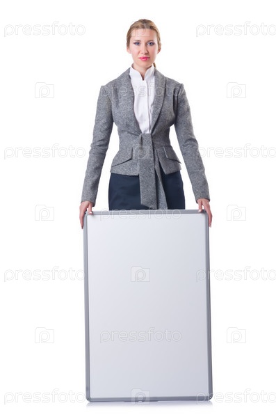 Бизнес-леди с баннером на белом фоне