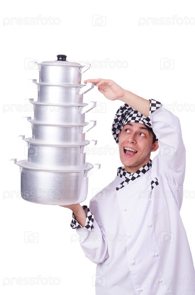 Повар со стопкой кастрюль на белом фоне