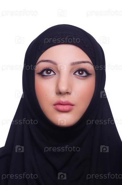 Мусульманская молодая женщина в хиджабе на белом