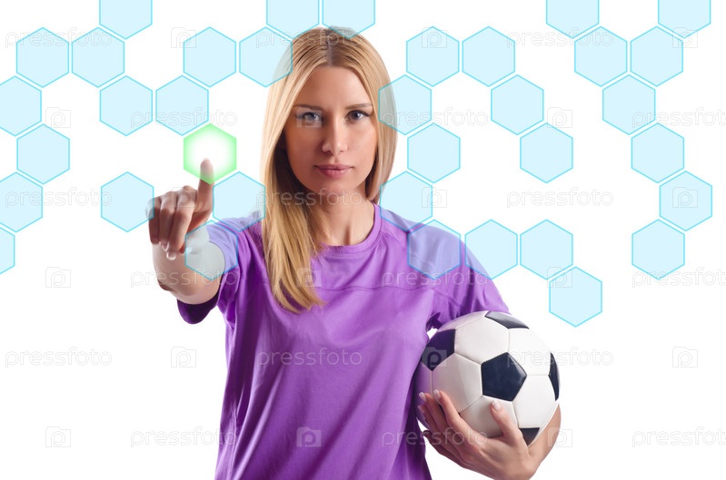 Женщина с футбольным мячом нажимает на виртуальные кнопки