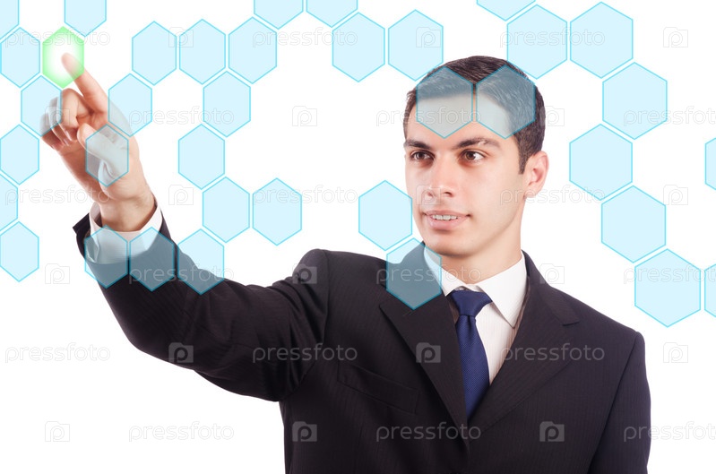 Молодой бизнесмен нажимает на виртуальные кнопки